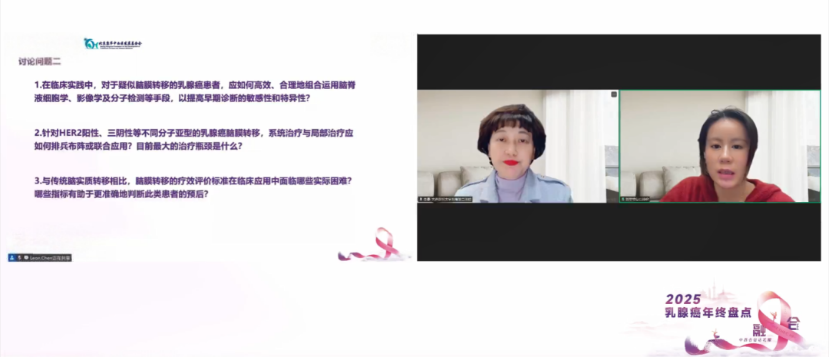 本环节由李曼教授主持,聚焦乳腺癌治疗中的难点——软脑膜转移,从早期诊断、鞘内治疗到多学科协作进行全面解析。在讨论中,刘莹莹医师与刘宁宁教授分别从技术创新与中西医协同角度,探讨了提升脑膜转移疗效的策略与方向。